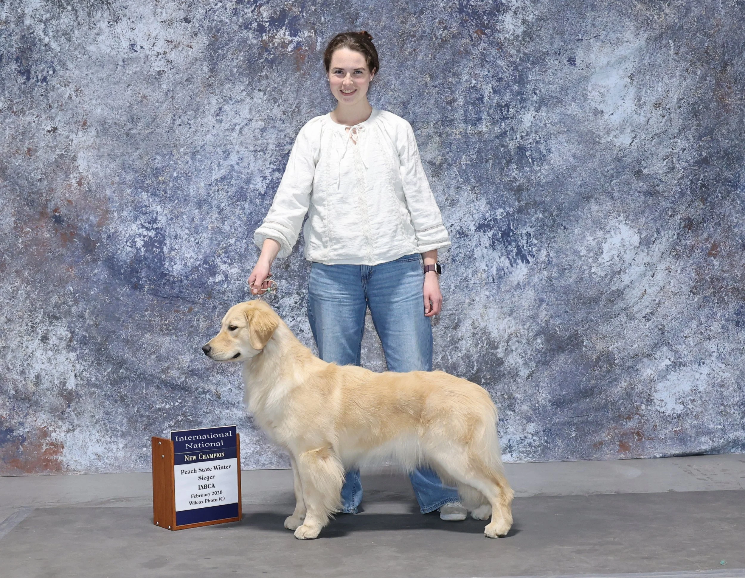 Honey is intuitive, gentle, and simply as sweet as her name implies! She was born on March 20, 2025. Honey has a nice texture to her coat with a kiss of golden color, favoring her sire’s expression and bringing out a beautiful blend of her dam and sire’s temperaments. She is level headed, easy to have around, and absolutely adores children, especially babies. She has a great retrieval drive and loves the water. We believe she has a high likelihood of being a therapy dog with her lovely mild manner. Honey has a lovely feminine type, proper coat, excellent angles and topline plus nice carriage in her gait while moving. She has both her IABCA puppy International and National Championship titles (Feb 2026) as well as being Canine Good Citizen Certified, all by 11 months old!