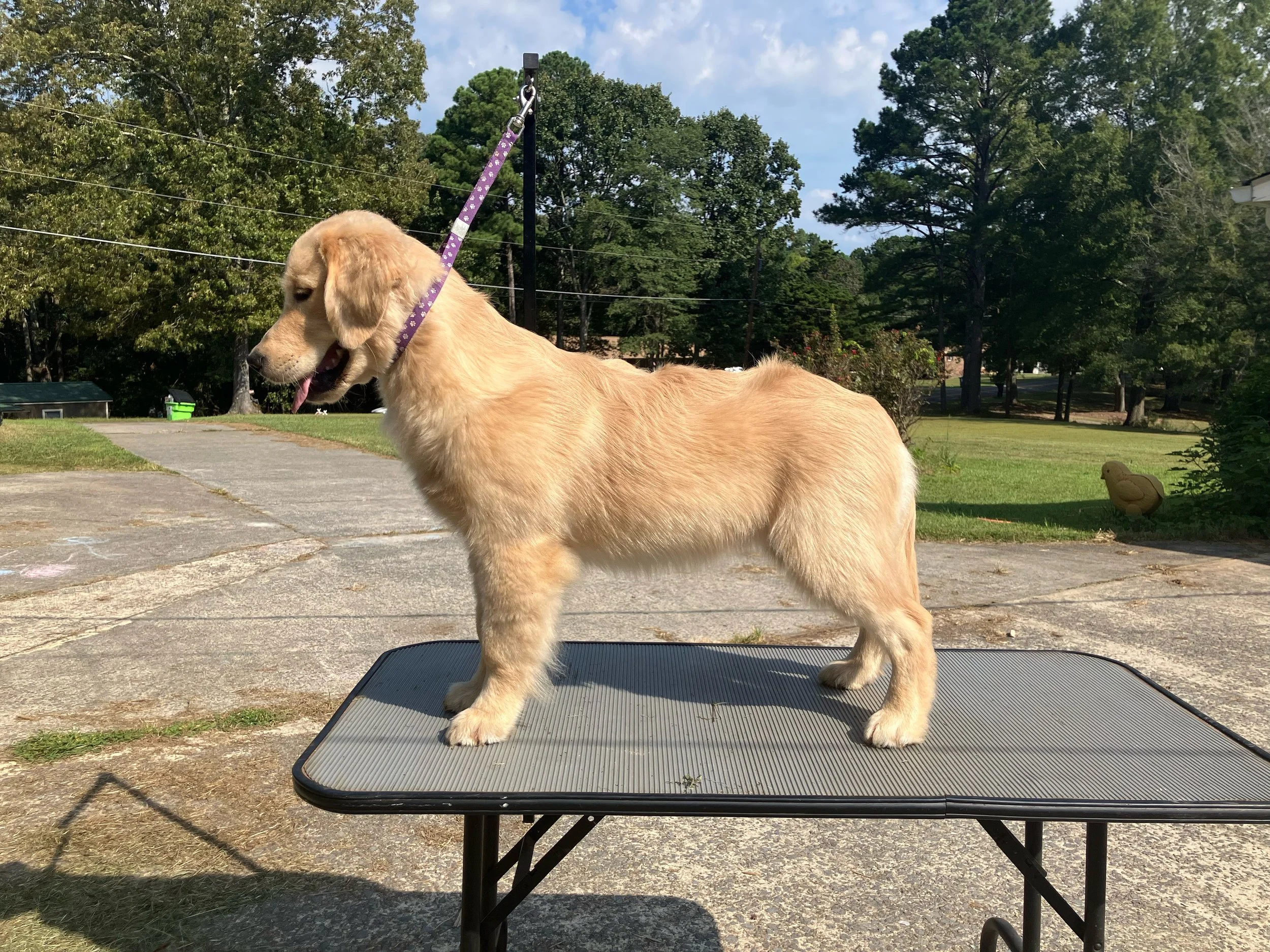 Honey is intuitive, gentle, and simply as sweet as her name implies! She was born on March 20, 2025. Honey has a nice texture to her coat with a kiss of golden color, favoring her sire’s (father’s) expression and bringing out a beautiful blend of her dam and sire’s (mother and father’s) temperaments. She is level headed, easy to have around, and absolutely adores children, especially babies. We believe she has a high likelihood of being a therapy dog with her lovely demeanor. Honey has a nice carriage when moving and we are excited to see her in the show ring as she grows out.