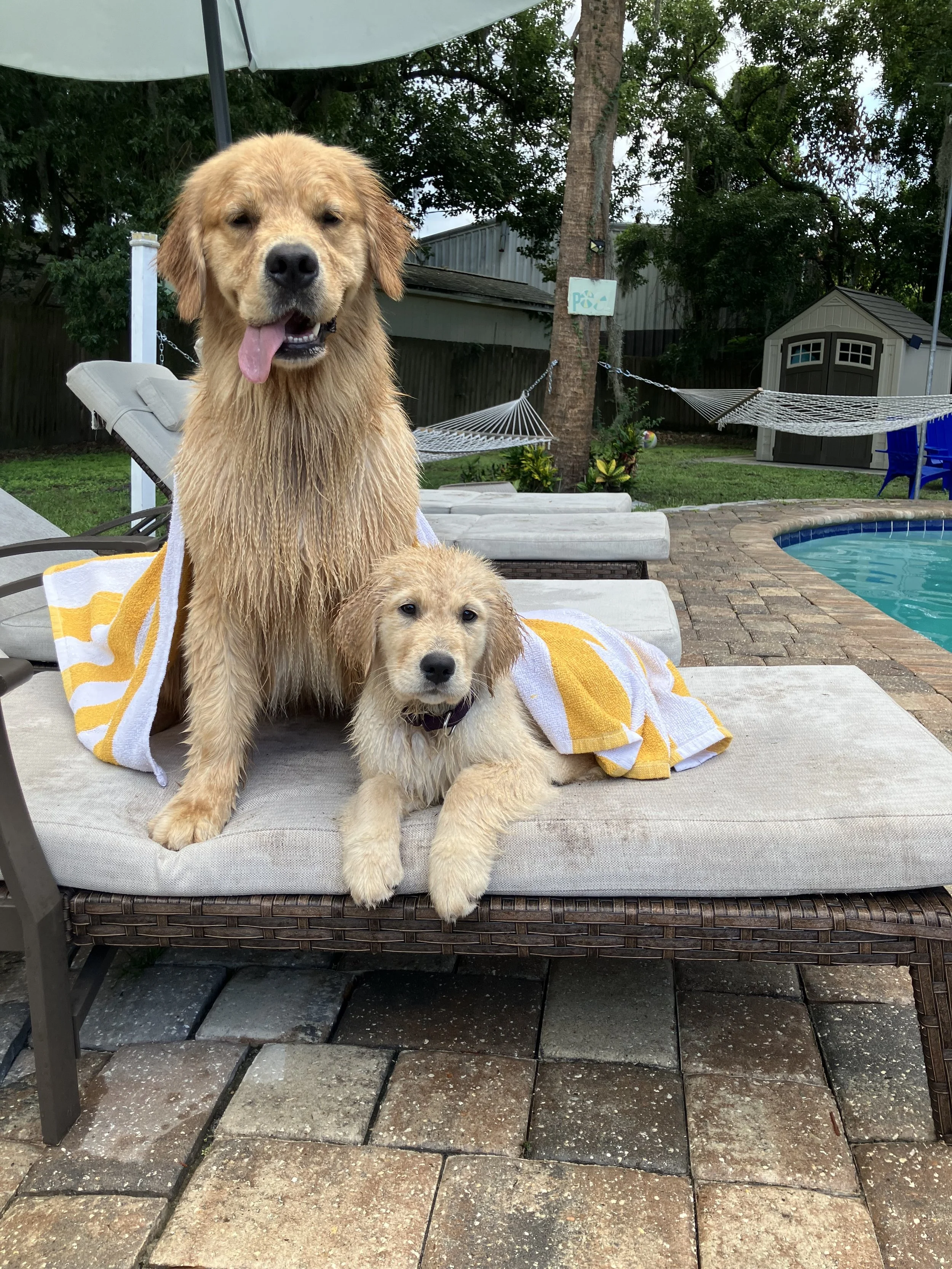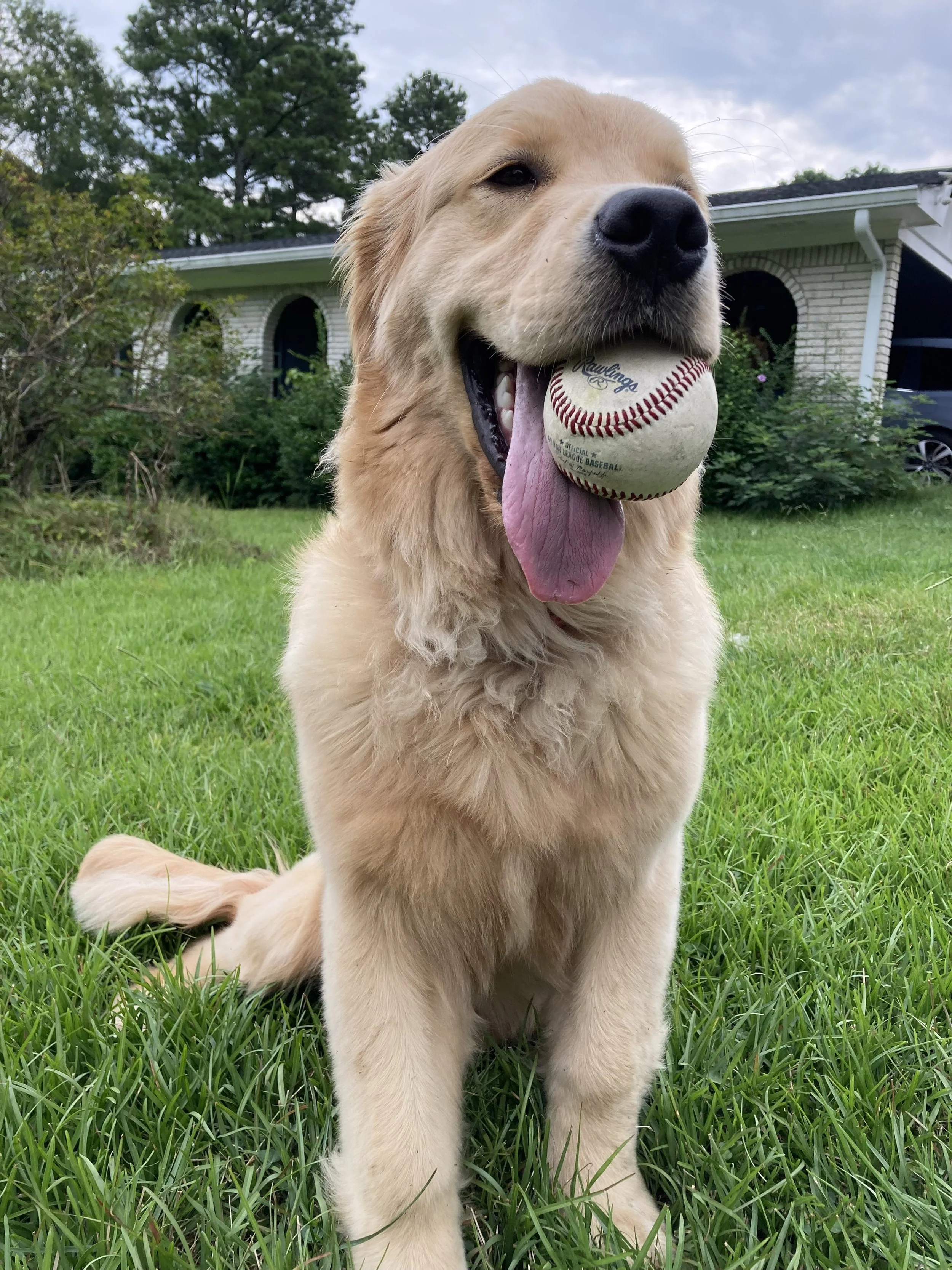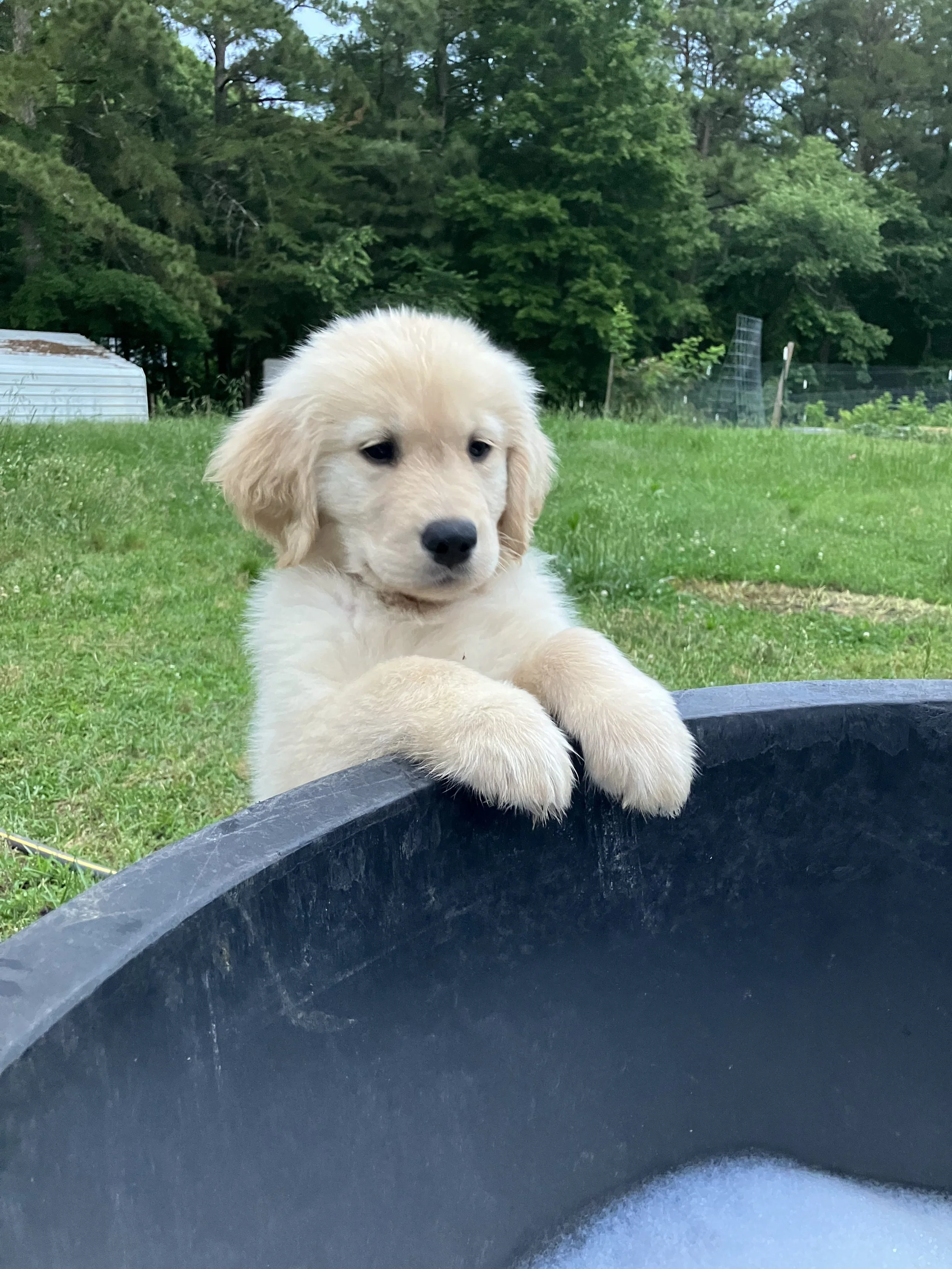 With a name inspired by the Chronicles of Narnia, Lucy is as magical as the books. She is our foundation golden and was born November 11, 2023. Lucy has a moderate energy level, is extremely tolerant and has such a biddable personality. Her favorite place to be is at my feet and exclusively retrieves baseballs…not a tennis ball! She is balanced, with a good prosternum and proper angles in her front and rear. Lucy carries her sire’s broad facial structure and sweet expression, while taking after her dam’s medium golden color and a luxurious wavy coat. She is in excellent body condition and we expect her to be a little over 70lbs when fully mature. Please click the links below for her most current health/genetic screenings and pedigree.